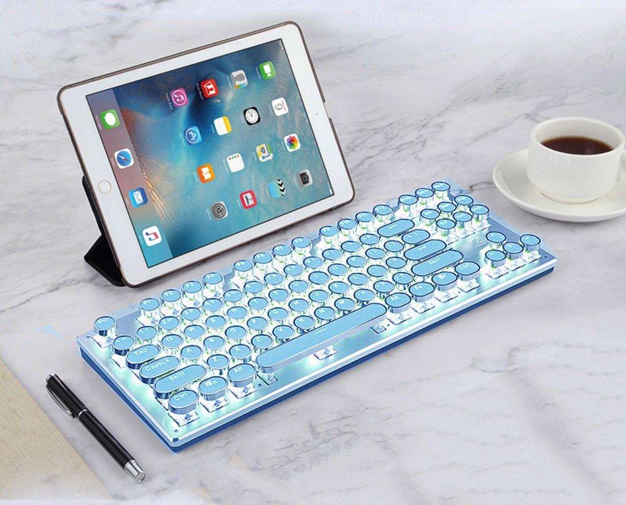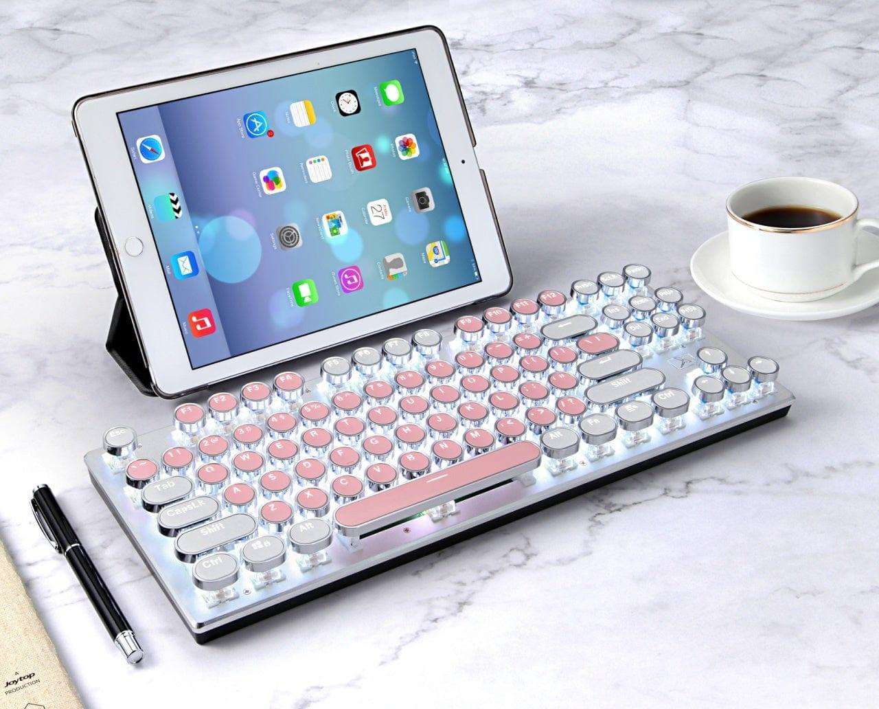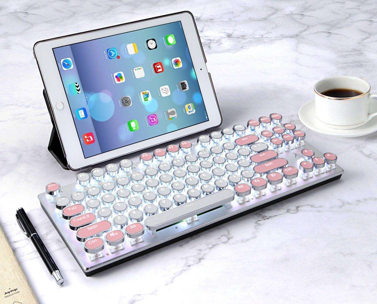 Revamp your typing experience with our 87-key Bluetooth keyboard, inspired by vintage typewriters, providing a superb tactile feel in a compact design. Upgrade your workspace with the elegance of the past and the convenience of the present.