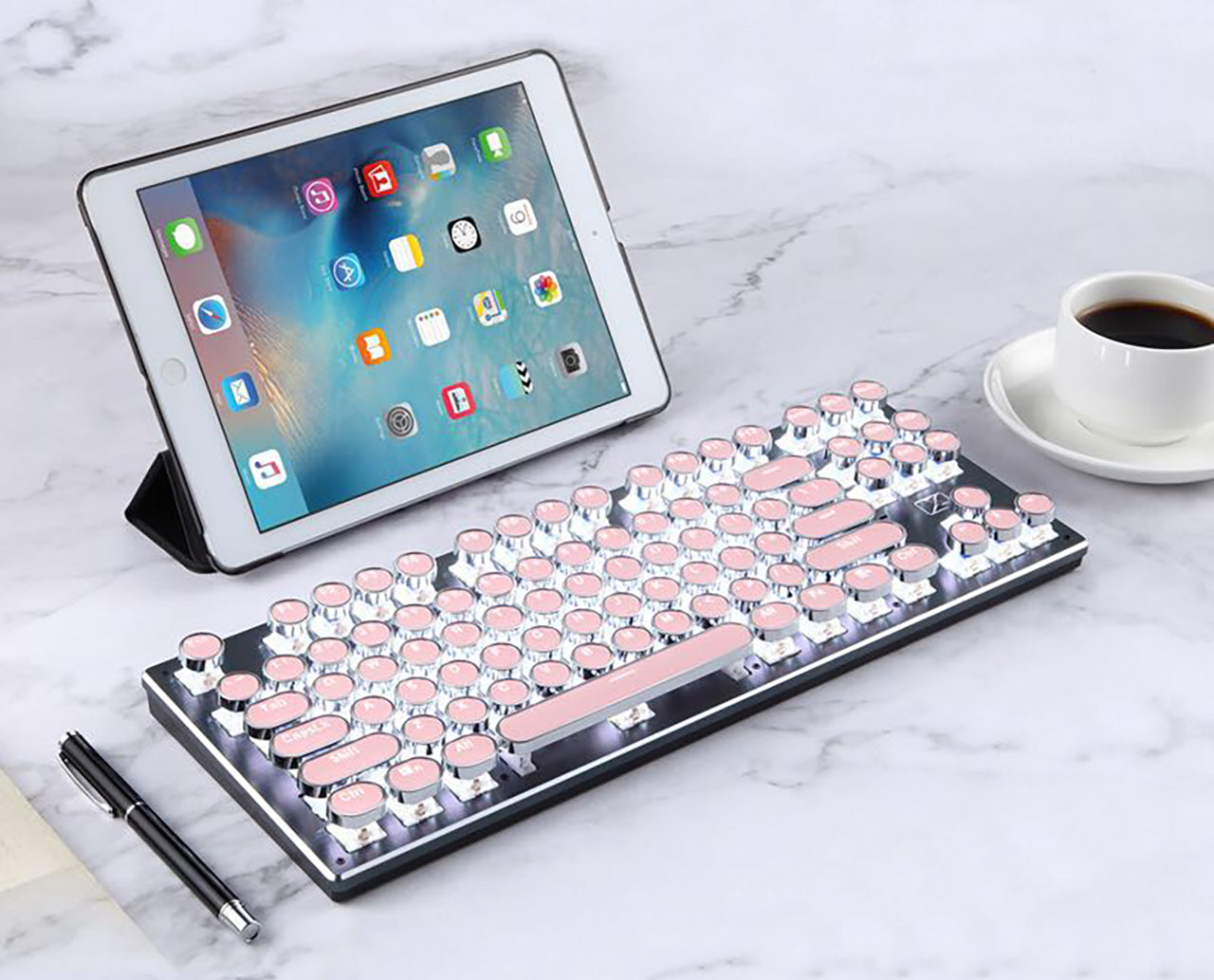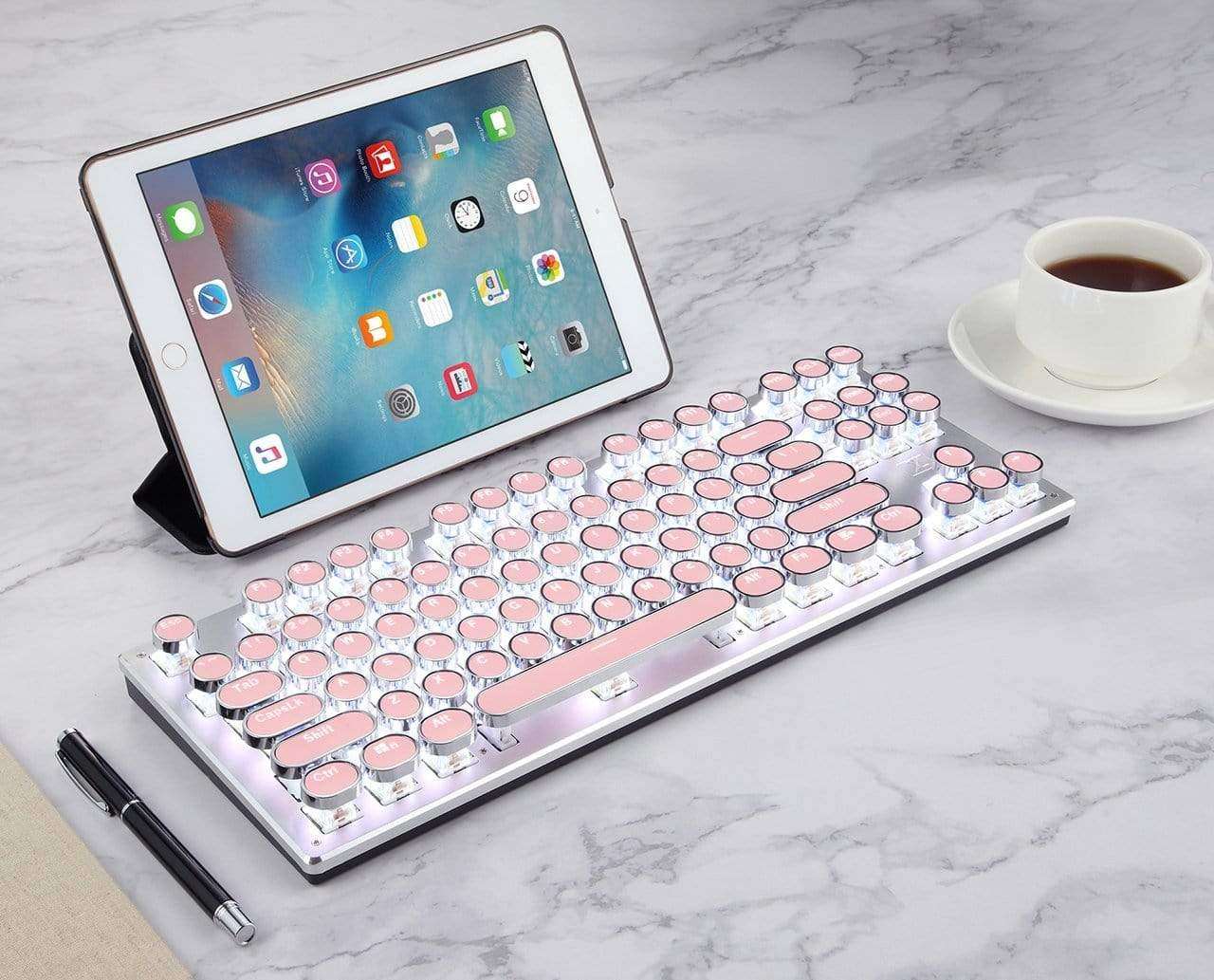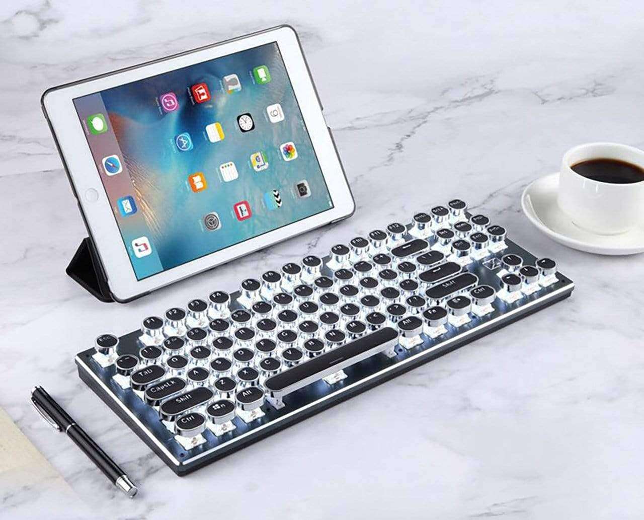 Revamp your typing experience with our 87-key Bluetooth keyboard, inspired by vintage typewriters, providing a superb tactile feel in a compact design. Upgrade your workspace with the elegance of the past and the convenience of the present.